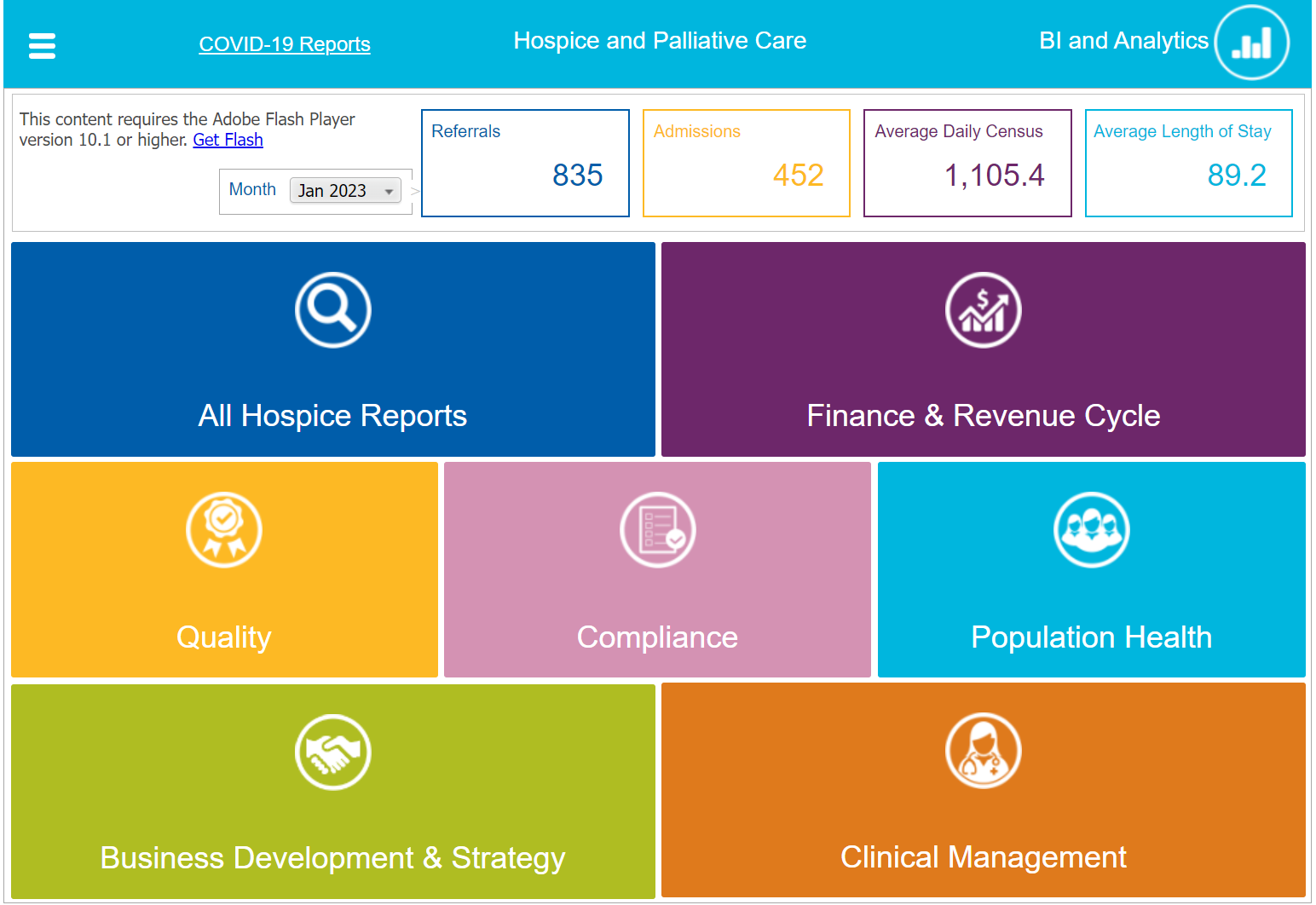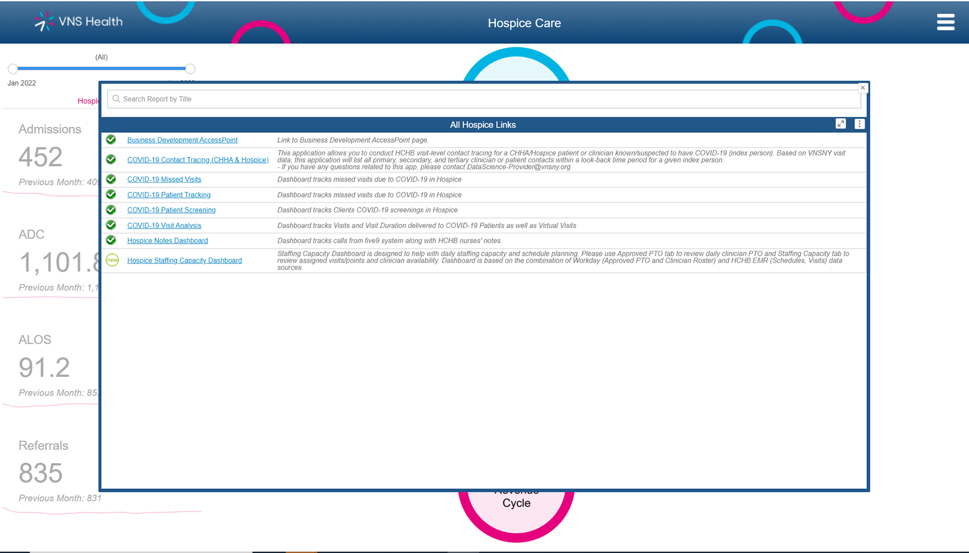 This is an example of a landing page for Hospice, a line of business within the organization. This page contains more detailed KPIs relating to hospice care (left), as well as the different teams within this line of business. Clicking on each department will reveal the reports related to that department; users can also click on 'All Hospice Reports' and search for a specific report.